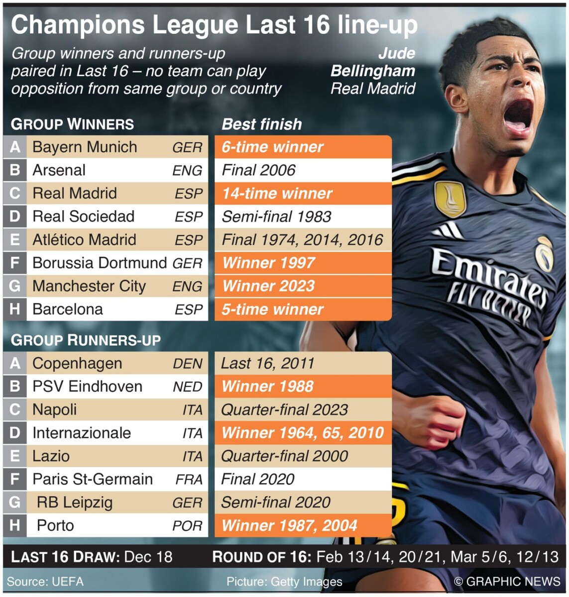 18 december 2023 – De loting voor de Laatste 16 van de Champions League vindt plaats in Nyon, Zwitserland, terwijl het toernooi de knock-outfase bereikt. Groepswinnaars worden gekoppeld aan de tweedeprijswinnaars, waarbij de eerste wedstrijden plaatsvinden op 13 en 14 februari.