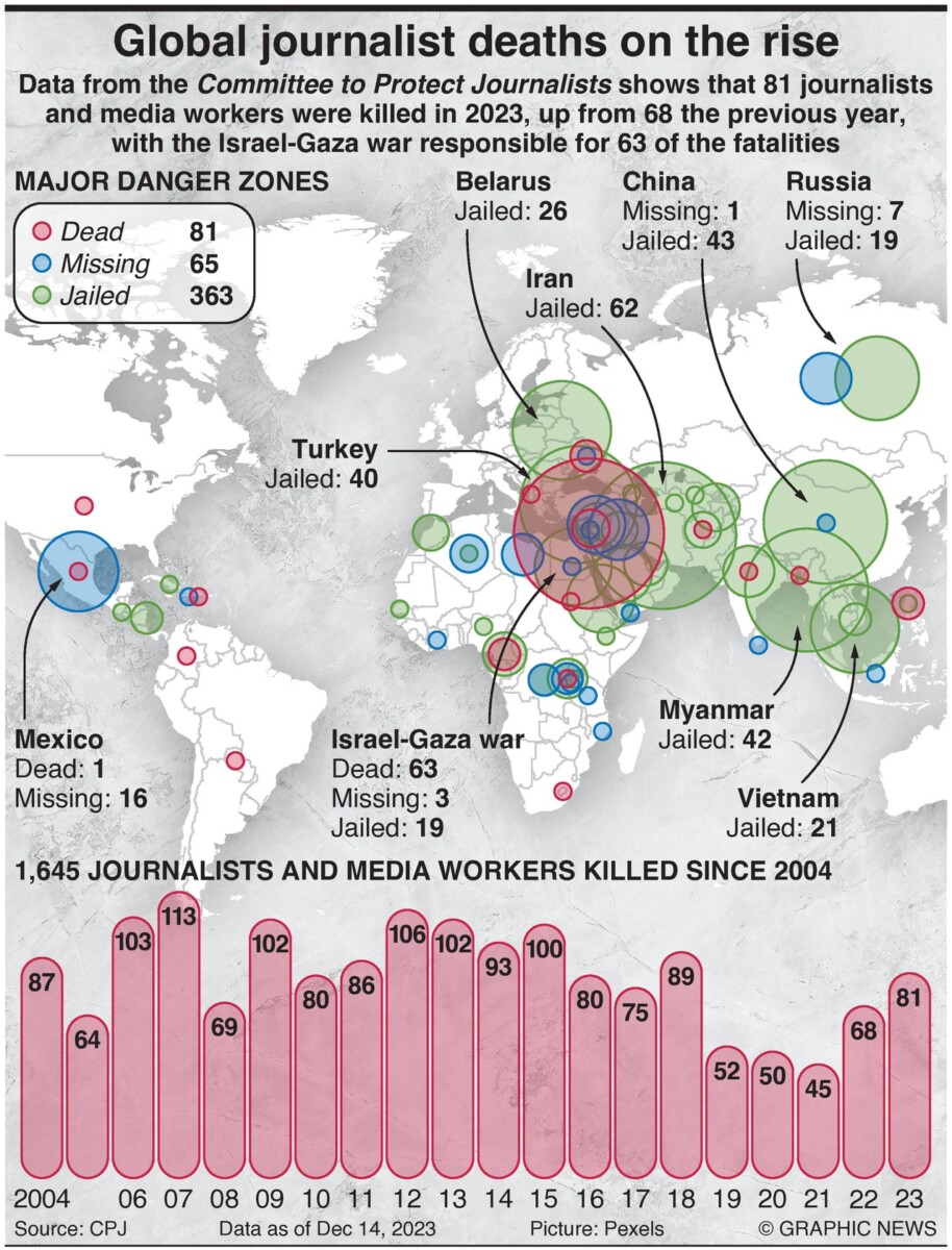 De laatste gegevens uit 2023 van een toonaangevende organisatie die de persvrijheid bevordert, benadrukken de ernstige gevaren waarmee journalisten over de hele wereld worden geconfronteerd, en in het bijzonder de gevaren van de oorlog tussen Israël en Gaza.