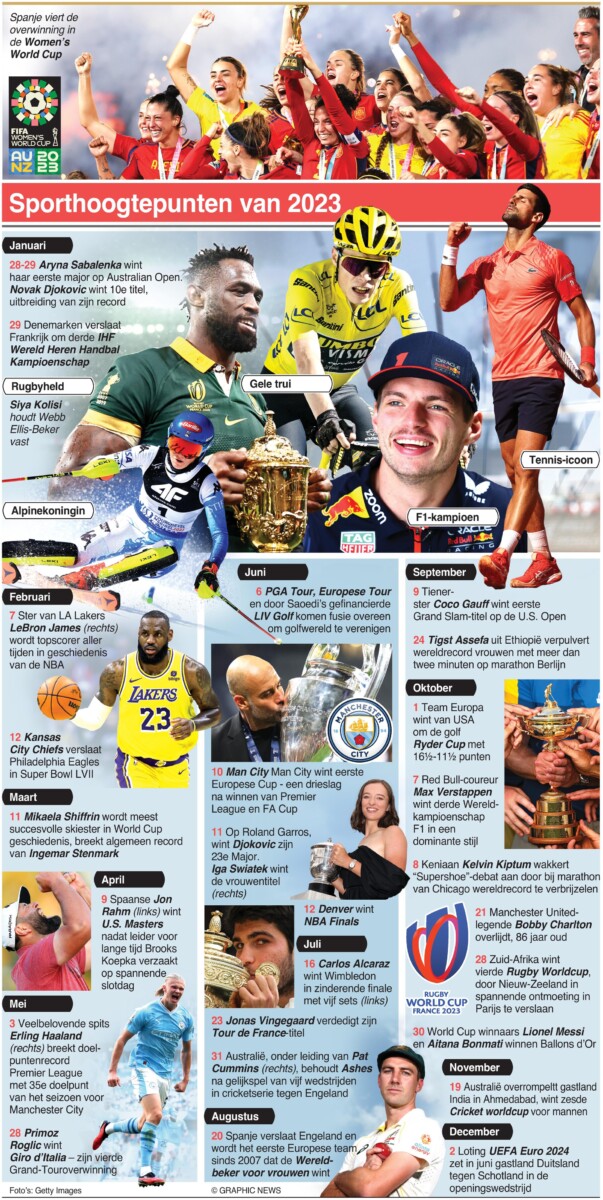 31 december 2023 – Een terugblik op enkele van de internationale sportevenementen en persoonlijkheden die in 2023 de krantenkoppen haalden. Belangrijke gebeurtenissen waren onder meer de Rugby World Cup in Frankrijk en het winnen van Spanje voor de eerste keer de FIFA Women’s World Cup in AustraliĂ«. Individuen die de hoogten bereikten, waren onder meer Novak Djokovic, Max Verstappen die de F1 voor het derde opeenvolgende seizoen veroverde, rijzende wielerster Jonas Vingegaard, alpine koningin Mikaela Shiffrin, golfer Jon Rahm, basketbalster Lebron James en Manchester City die de UEFA Champions League won.