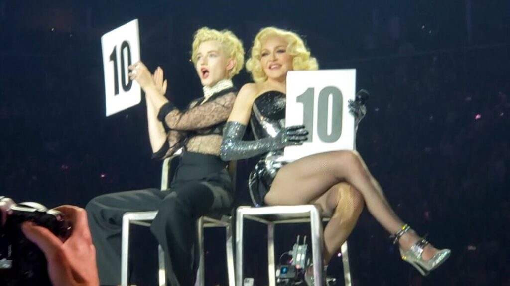 Nadat RuPaul’s Drag Race-winnaar Bob the Drag Queen een set stoelen op het podium had geplaatst, liep Garner – gekleed in een doorschijnend zwart topje met een witte kraag geïnspireerd op Madonna’s videoclip “Erotica” – de catwalk af om zich aan het einde van de show bij Madonna te voegen. het platform.