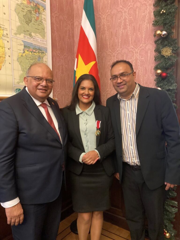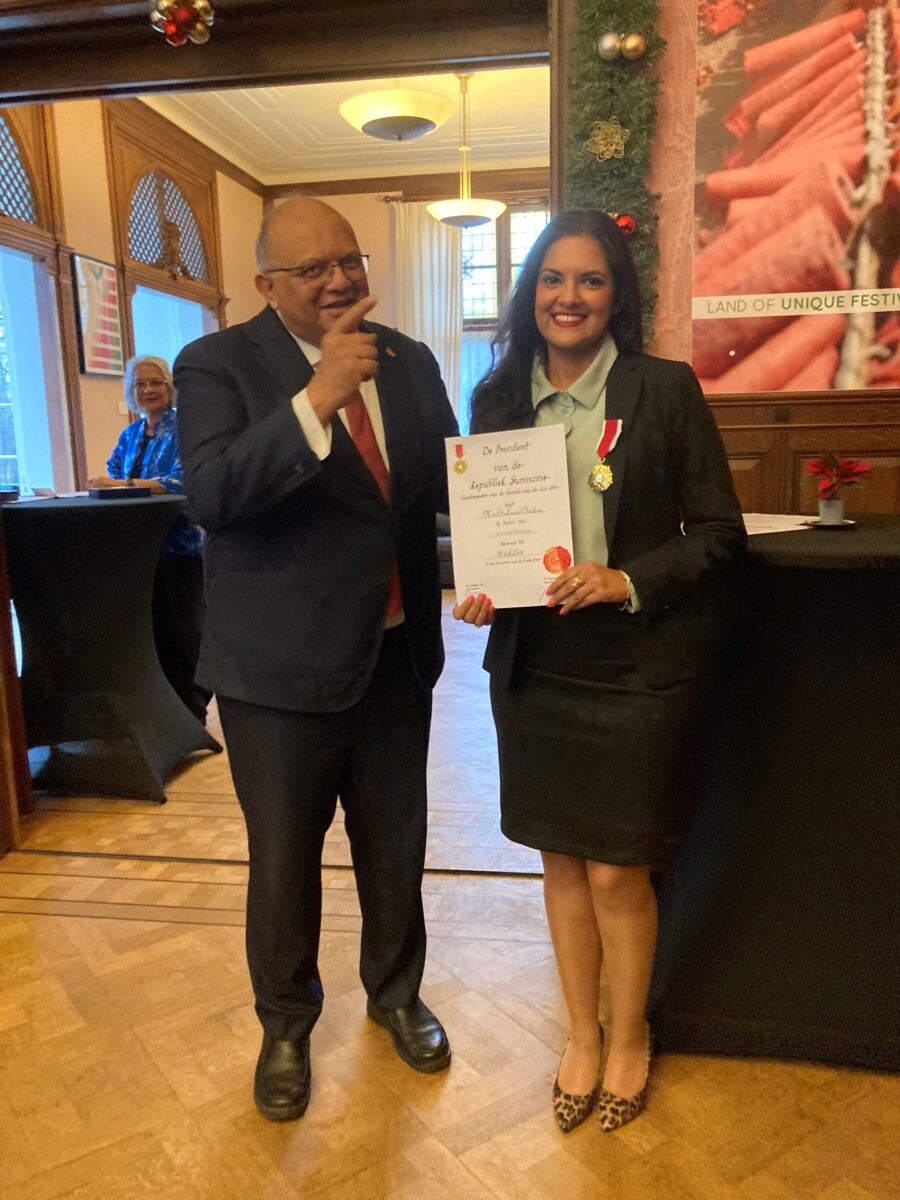 De in Almere woonachtige Chietra Bahora, voorzitter van de ChietSana Foundation, heeft dinsdag 19 december een hoge onderscheiding ontvangen van Suriname. Namens de president van Suriname, speldde ambassadeur Rajendre Khargi de versierselen op bij Chietra tot Ridder in de Ere-orde van de Gele Ster.