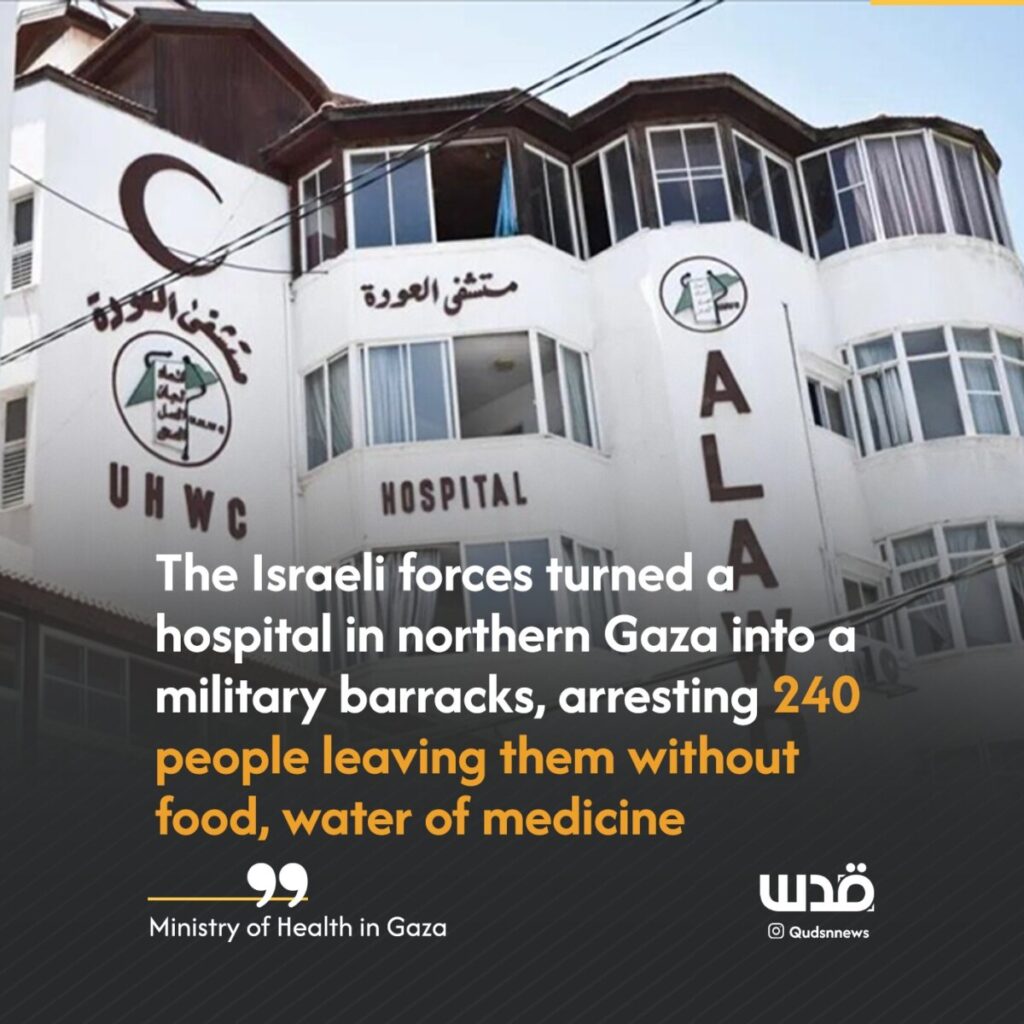 Woordvoerder van het Ministerie van Volksgezondheid, Dr. Ashraf Al-Qudra: De Israëlische bezettingstroepen veranderden het Al-Awda-ziekenhuis in een militaire kazerne en arresteerden 240 mensen, waaronder 80 medisch personeel, 40 patiënten en 120 ontheemden in het ziekenhuis zonder water, voedsel, of medicijnen, en het voorkomen van verplaatsingen tussen afdelingen.