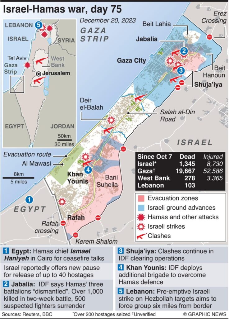 In de Gazastrook is de situatie gespannen; bewoners van de zuidelijke stad Khan Younis rapporteren verhoogde gevechtsactiviteiten. Israëlische bronnen geven aan dat sinds het begin van de vijandelijkheden 1.139 individuen zijn omgekomen door Hamas-geïnitieerde aanvallen, waaronder 695 Israëlische burgers met 36 kinderen onder de slachtoffers.