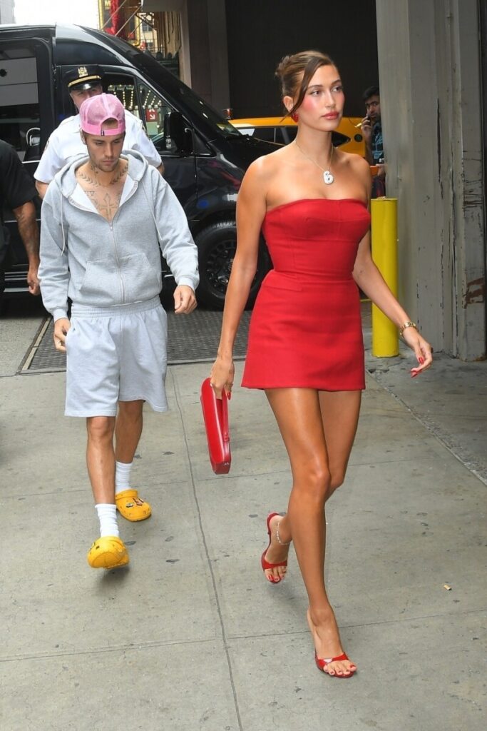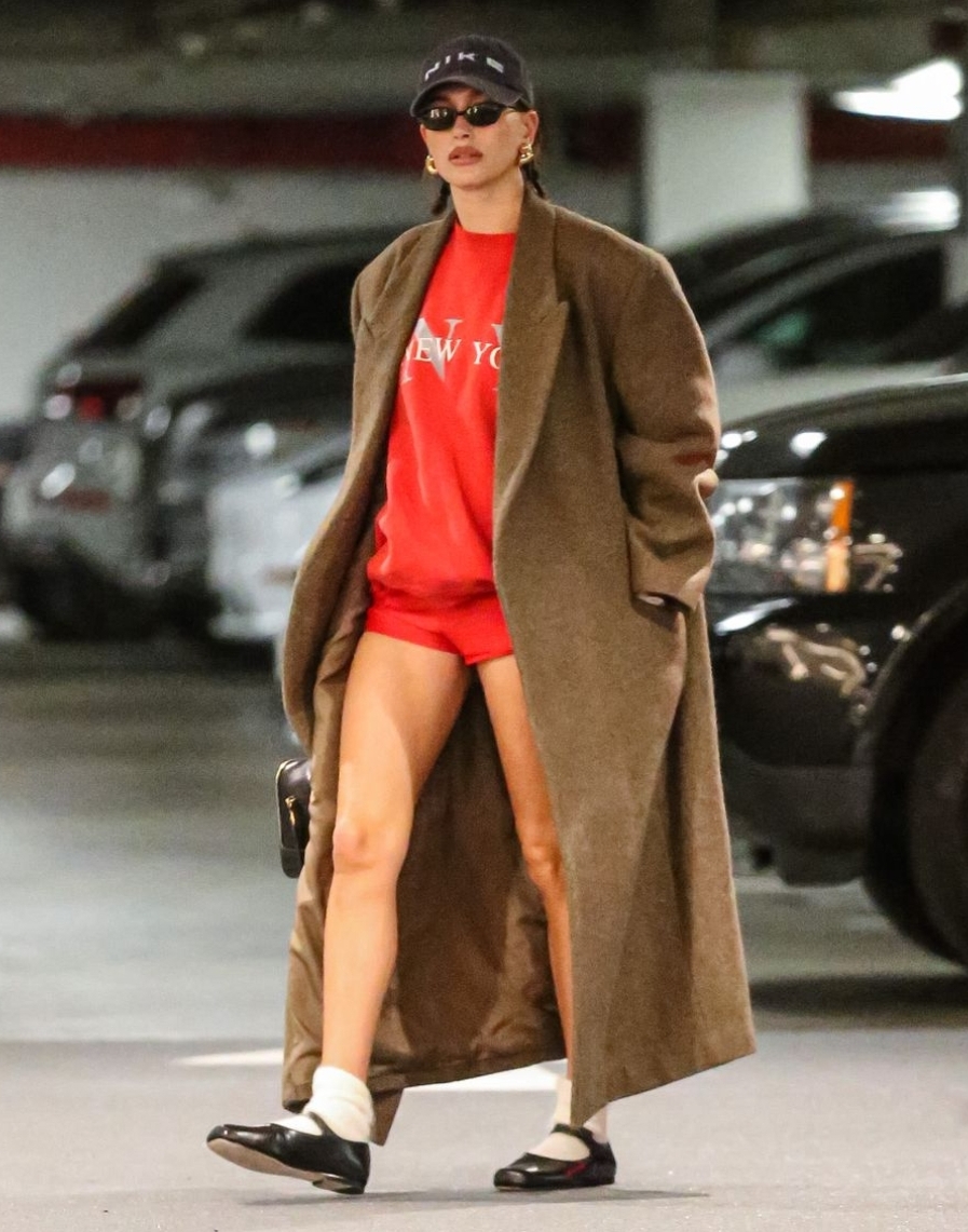 Nu omarmt Hails opnieuw een gedurfde trend, namelijk de broekloze trend. Waar Hailey en Justin regelmatig het ultieme ANWB-koppel zijn in matchende outfits, gaan ze tijdens hun meest recente uitje voor compleet andere looks. Het grootste verschil: JB draagt een broek, terwijl Hailey die van haar op de grond van haar inloopkast heeft laten liggen. Het model gaat gehuld in een oversized wollen mantel in amandelbruin met daaronder Mary Janes-flats, witte sokken en een Nike-pet. De rest van haar outfit wordt opgemaakt door een knalrode jumper, punt. Dat was haar hele outfit.