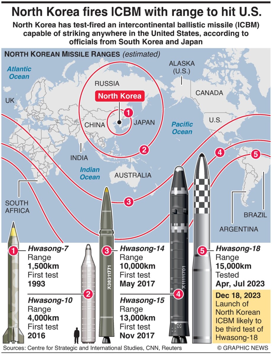 December 18, 2023 – Noord-Korea heeft een ballistische langeafstandsraket getest die overal in de Verenigde Staten kan raken, aldus functionarissen uit Zuid-Korea en Japan.