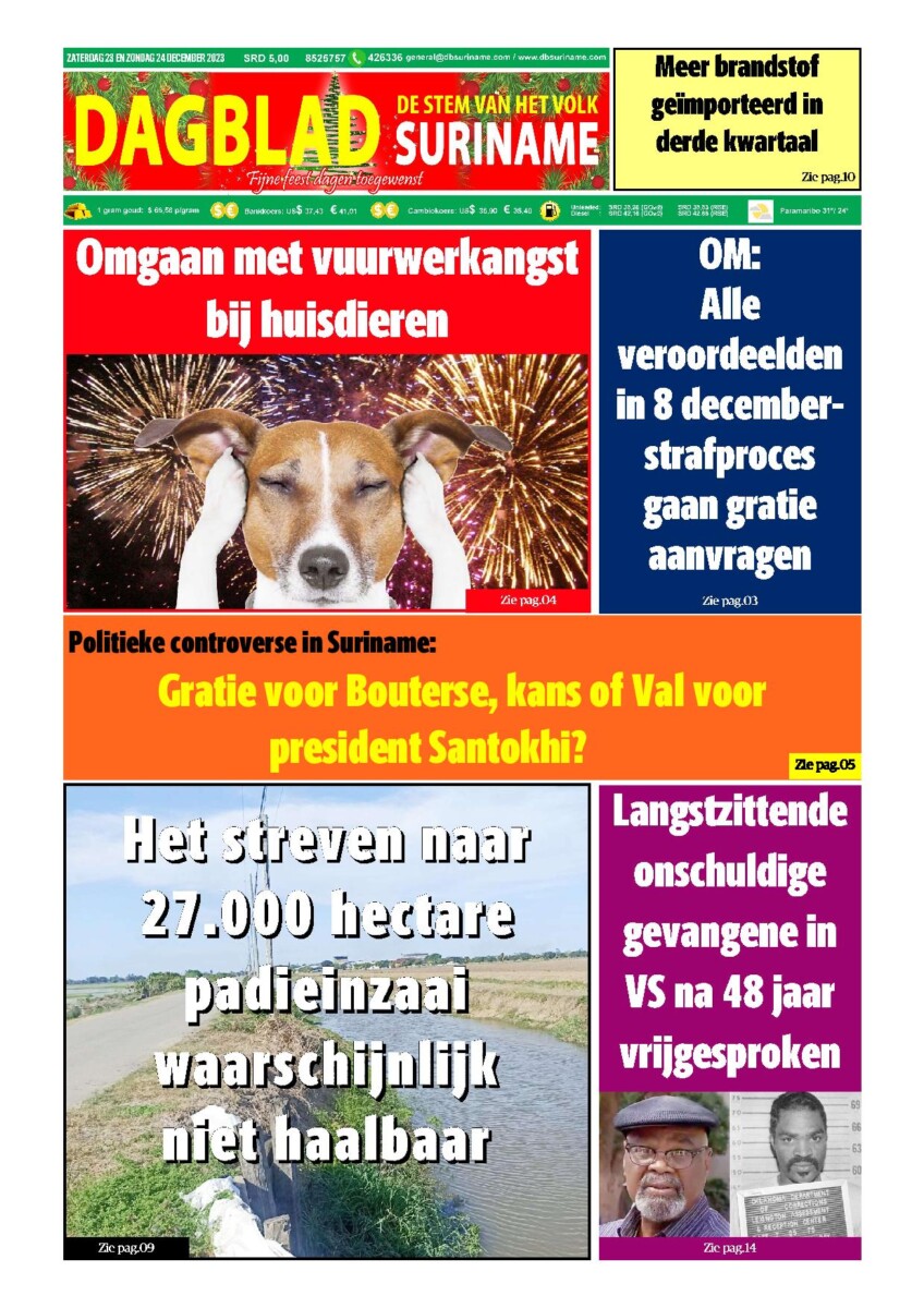 Dagblad Suriname zaterdag 23 december 2023 Geplaatst op december 23, 2023december 22, 2023 Bericht navigatie VorigeHoogzwangere vrouw en partner plegen meerdere diefstallen in winkelsVolgendeAantal verkeersdoden lijkt dit jaar relatief minder dan vorig jaar