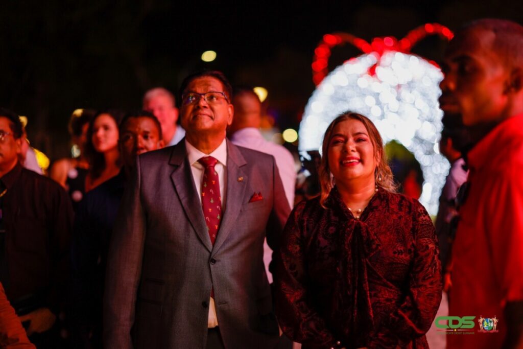President Chandrikapersad Santokhi en first lady Mellisa Santokhi-Seenacherry hebben vrijdag 22 december officieel de lichten aangemaakt van het Enchanted Christmas Forest op het Onafhankelijkheidsplein.