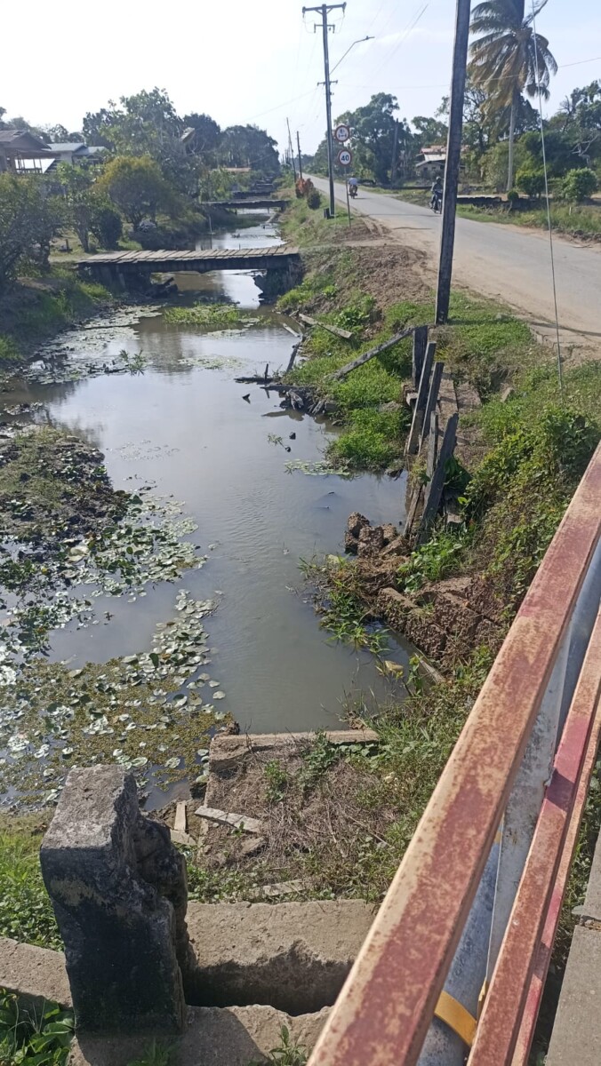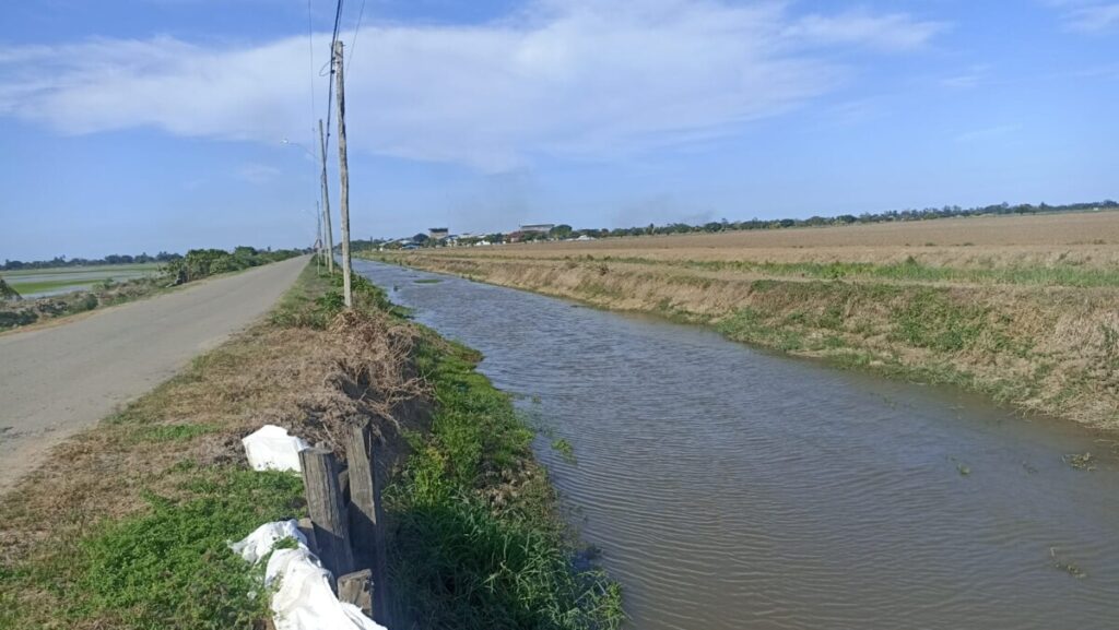 De watersituatie in het irrigatiekanaal langs een uitgestrekte padieareaal van het rijstbedrijf Manglie. Op de achtergrond nog duidelijk te zien dat het padieareaal nog droog staat, dus nog niet is ingezaaid.
