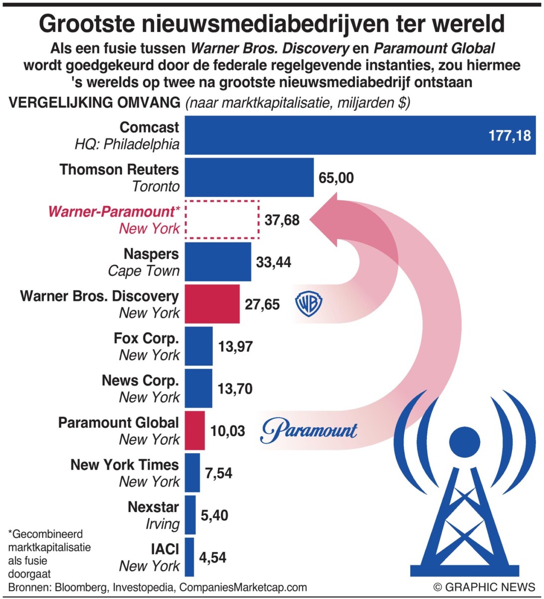 In het geval van een fusie tussen Warner en Paramount zouden ze het derde grootste nieuwsmediabedrijf ter wereld worden, na alleen Comcast en Thomson Reuters.