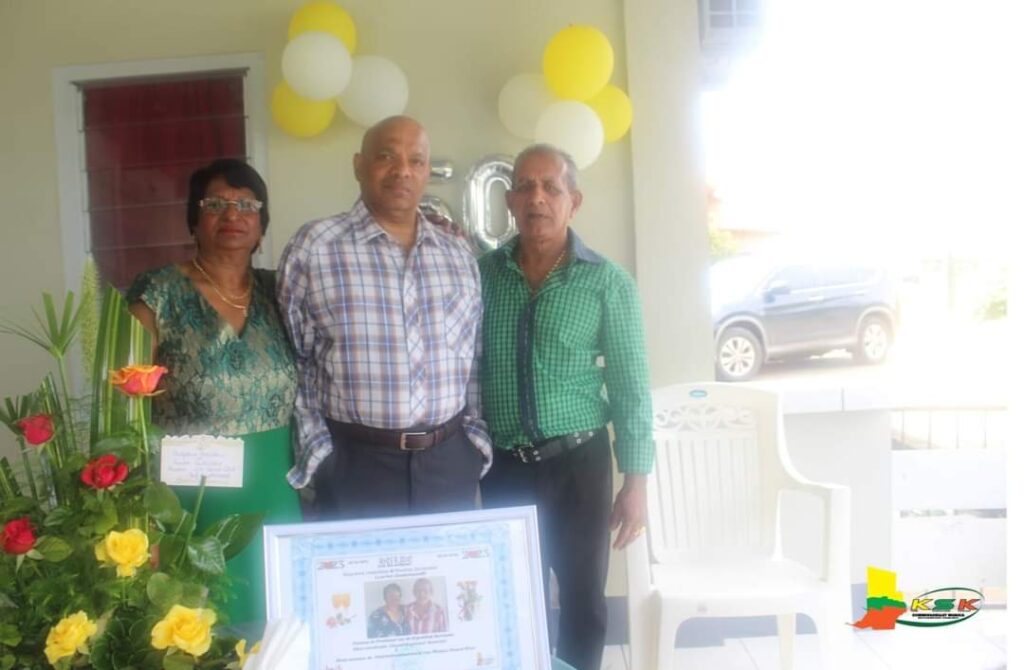Mevrouw Santadebie Panchoe heeft haar vader geholpen in de landbouw vanaf jonge leeftijd. Het echtpaar heeft 3 kinderen 7 kleinkinderen. Districtscommissaris Bholanath Narain bracht de felicitaties namens de regering over aan het echtpaar.