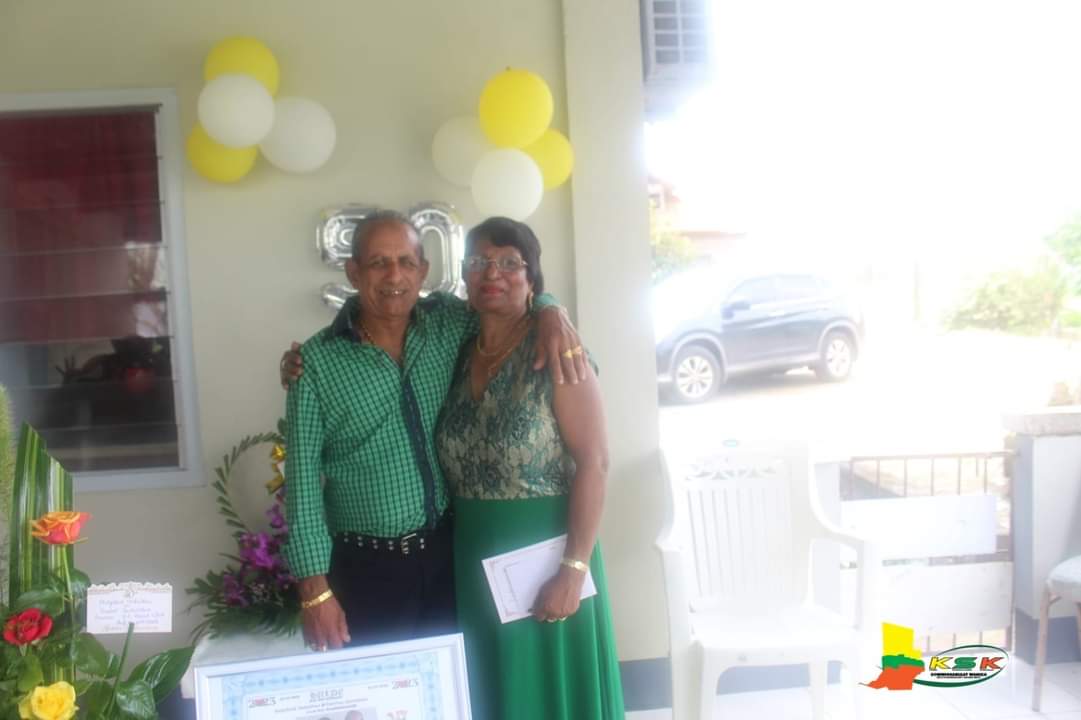 Mevrouw Santadebie Panchoe heeft haar vader geholpen in de landbouw vanaf jonge leeftijd. Het echtpaar heeft 3 kinderen 7 kleinkinderen. Districtscommissaris Bholanath Narain bracht de felicitaties namens de regering over aan het echtpaar.