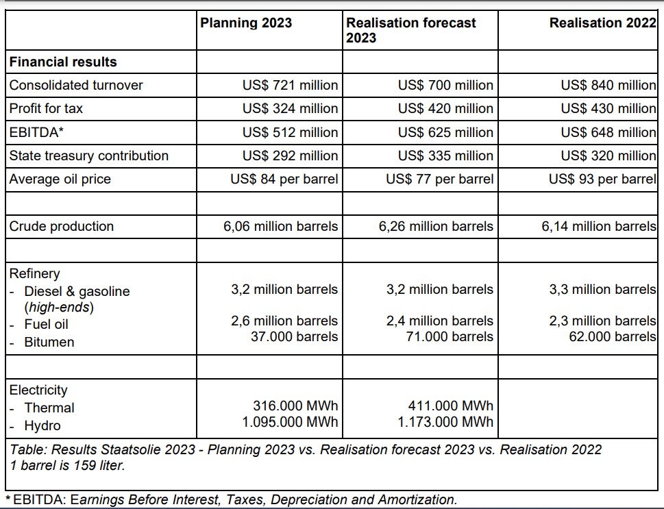 Over 2023 wordt verwacht dat Staatsolie en zijn dochterondernemingen een geconsolideerde omzet zullen realiseren van ruim US$ 700 miljoen. De lagere gemiddelde olieprijs van US$ 77 per vat in 2023, ten opzichte van US$ 93 per vat in 2022, heeft ertoe geleid dat de totale inkomsten enigszins lager liggen dan vorig jaar.