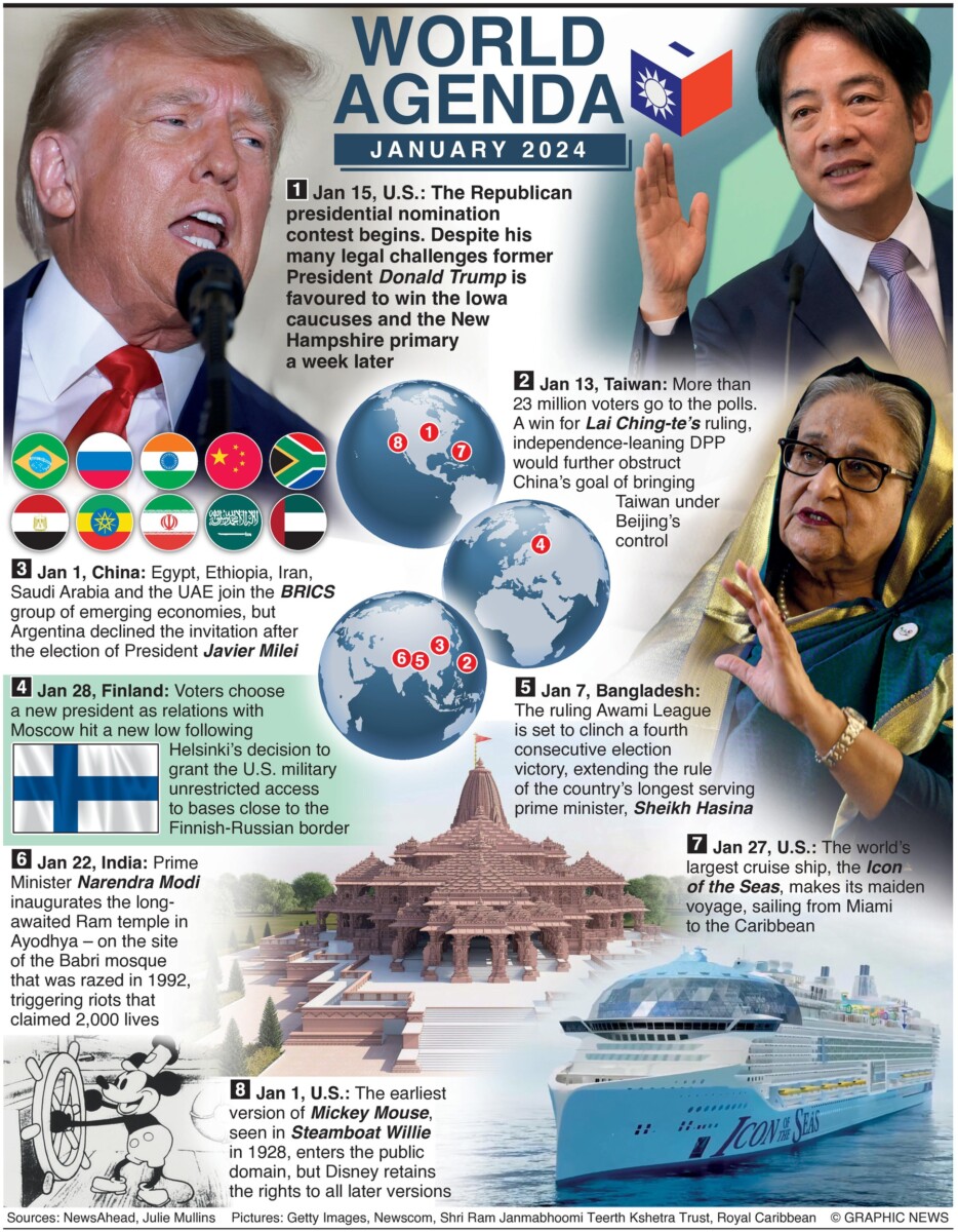1 januari 2024 – 31 januari 2024 – Tot de gebeurtenissen in januari behoren onder meer het begin van de Republikeinse presidentiële nominatiewedstrijd, verkiezingen in Taiwan, Bangladesh en Finland, de uitbreiding van de BRICS-groep en de eerste reis van ’s werelds grootste cruiseschip.