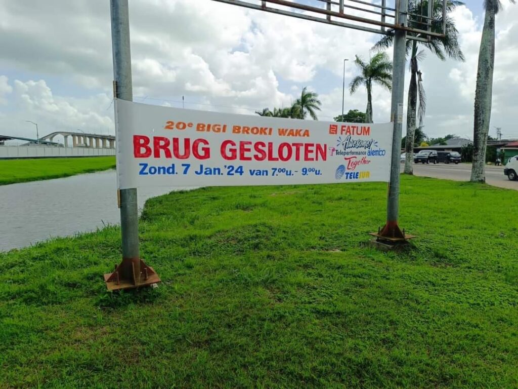 In verband met de 20e Bigi Broki Waka 2024 zondag 7 januari zal de Wijdenboschbrug tussen 07.00 uur en 09.00 uur worden afgesloten voor het verkeer. zo bericht het Korps Politie Suriname..