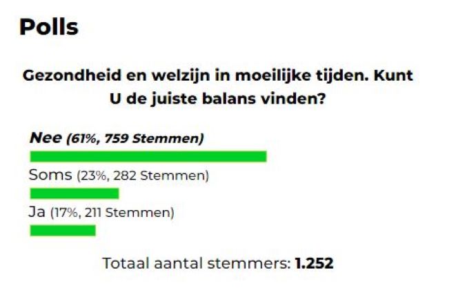 Uiteen recente poll op de website van Dagblad Suriname is gebleken dat een overgrote meerderheid van de burgers moeite heeft om in de huidige slechte economische omstandigheden de juiste balans te vinden tussen gezondheid en welzijn. Van de respondenten geeft 61% (759 stemmen) aan hierin helemaal niet te slagen, terwijl 23% (282 stemmen) aangeeft dit soms te kunnen en slechts 17% (211 stemmen) stelt geen moeite te hebben met deze balans.