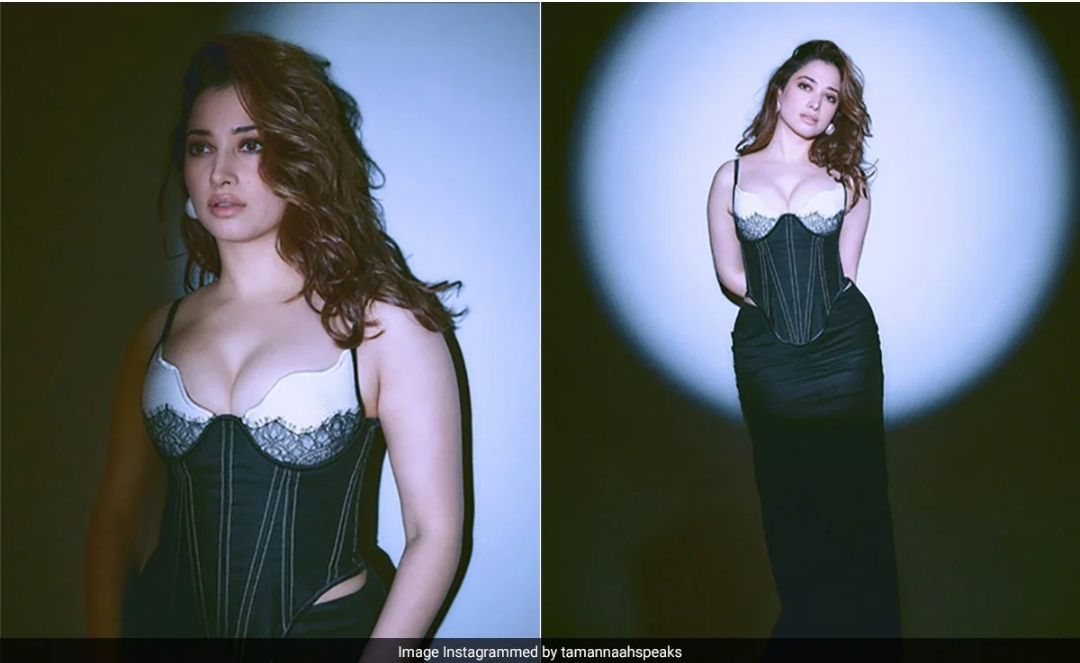 Tamannaah’s look omvatte het Black Swan-korset 2.0 en een plooirok volgens de Instagram-post van de ontwerper.