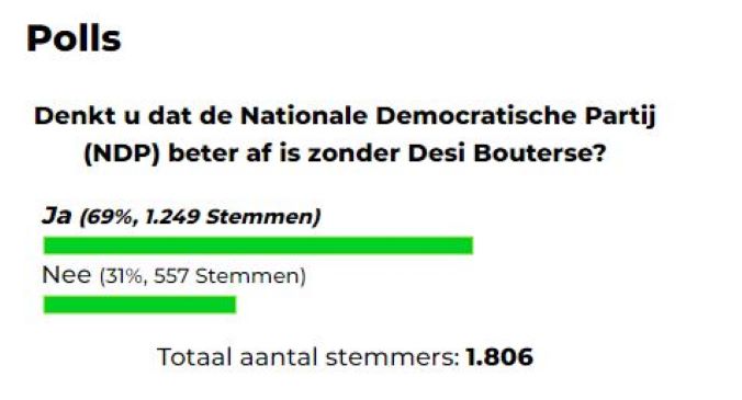 De uitslag was ondubbelzinnig – een overweldigende meerderheid van 69% (1.249 stemmen) meent dat de partij erop vooruit zou gaan zonder Bouterse, tegenover slechts 31% (557 stemmen) die het tegendeel beweert.
