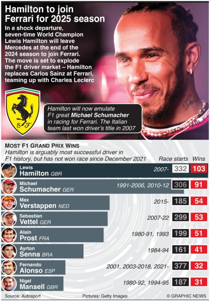 De 39-jarige Hamilton won zes coureurskampioenschappen met Mercedes sinds zijn komst in 2013 en heeft aangegeven zich volledig in te zetten om zijn laatste jaar positief af te sluiten. Hij zal Carlos Sainz vervangen bij Ferrari, aangezien het contract van de Spanjaard afloopt na het seizoen 2024. Hamilton gaat samenrijden met Charles Leclerc bij Ferrari, die in januari een langetermijncontract tekende met het team.