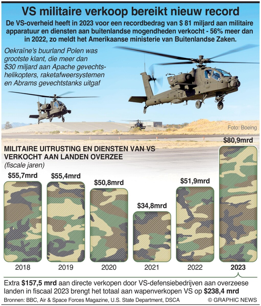In 2023 heeft de Amerikaanse regering voor een recordbedrag van $81 miljard aan militaire uitrustingen en diensten verkocht aan buitenlandse machten, wat een stijging van 56% ten opzichte van 2022 betekent, aldus het Amerikaanse Ministerie van Buitenlandse Zaken. Deze directe overdrachten van militaire goederen en diensten bereikten een recordhoogte van $80,9 miljard in het fiscale jaar 2023, wat een stijging van meer dan 50% is vergeleken met het voorgaande jaar.