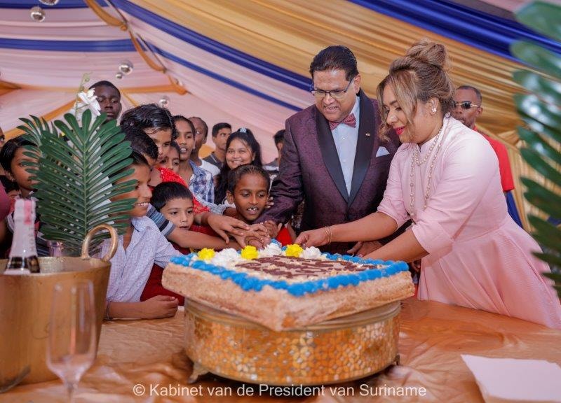 President Chandrikapersad Santokhi heeft zijn 65ste verjaardag vandaag, gisteren – vrijdag 2 februari – ingeluid samen met weeskinderen van verschillende tehuizen, personen met een beperking en senioren burgers in de achtertuin van het presidentieel paleis.