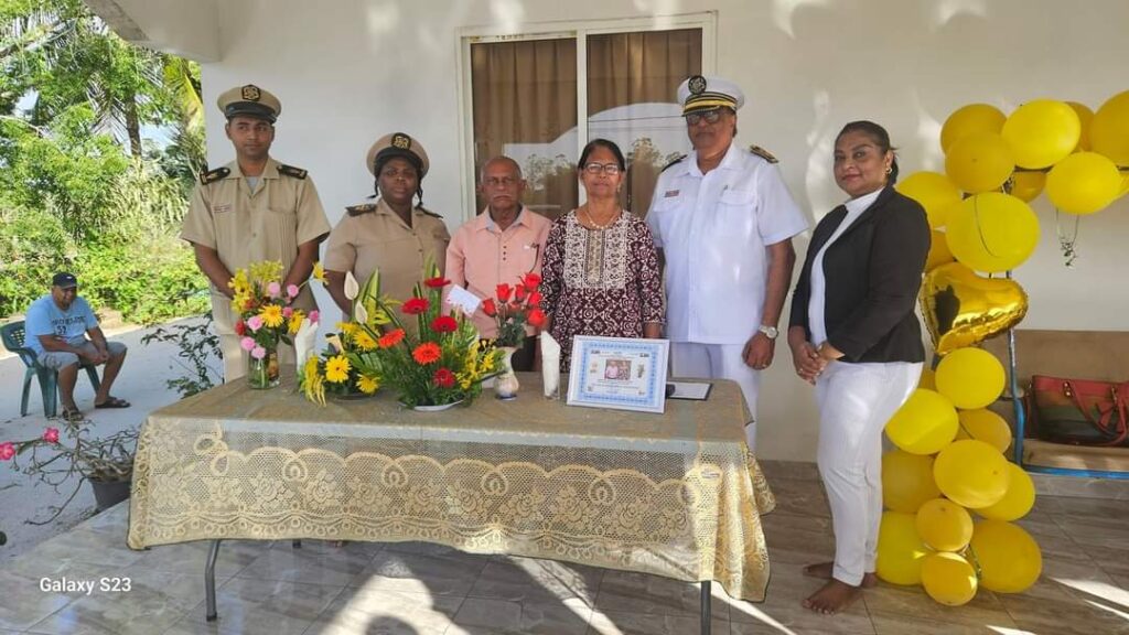 Districtscommissaris Bholanath Narain van Paramaribo Noord-West bracht de felicitaties namens de regering over aan het echtpaar. Het echtpaar mocht een bloemstuk, een ingelijste foto, een felicitatiekaart en de gebruikelijke gesloten enveloppe met inhoud in ontvangst nemen. Het VHP-Assembleelid Berkat Mohabali, die een buurtbewoner is, was ook aanwezig.
