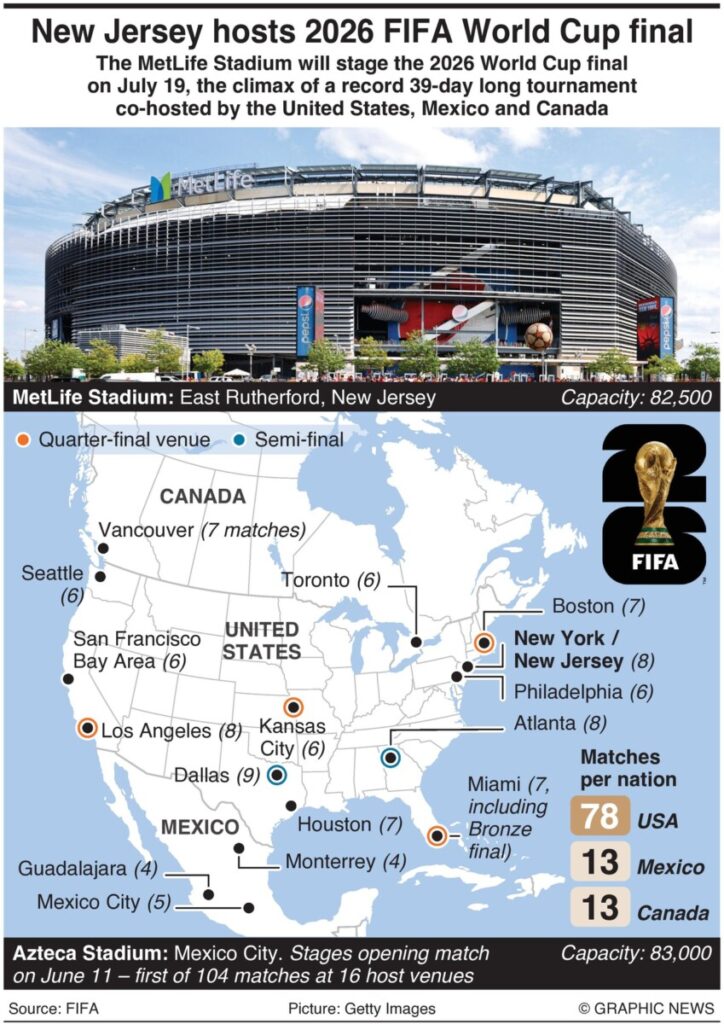 De finale van de Wereldbeker 2026 zal plaatsvinden in het MetLife Stadion in East Rutherford, New Jersey, op 19 juli 2026, aldus FIFA-president Gianni Infantino, terwijl hij het volledige speelschema voor het toernooi met 48 teams onthulde.
