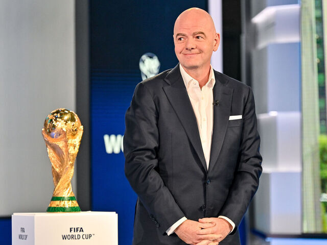 FIFA-President Gianni Infantino met de FIFA Wereldbeker Winnaarstrofee tijdens de FIFA Wereldbeker 2026 Gaststad Aankondiging op 16 juni 2022 in New York City.