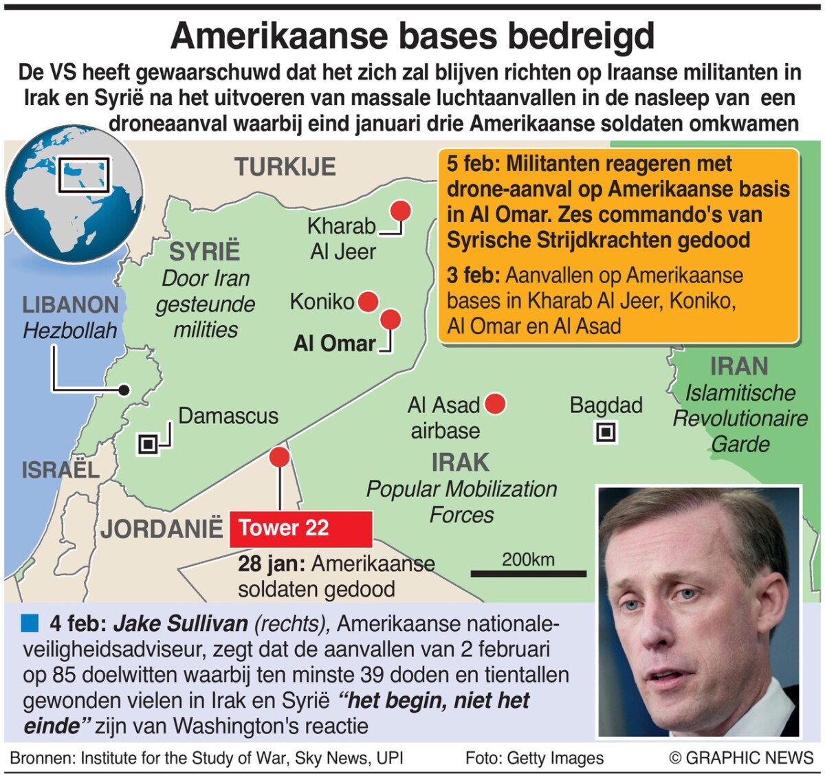 Op zondag zei Jake Sullivan, de Amerikaanse nationale veiligheidsadviseur, dat aanvallen op 85 doelen die minstens 39 mensen doodden en tientallen anderen verwondden in Irak en Syrië “slechts het begin, en niet het einde” zijn van Washingtons reactie.