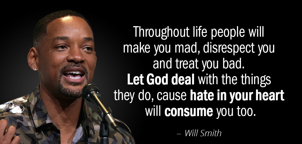 “Throughout life people will make you mad, disrespect you and treat you bad. Let God deal with the things they do, cause hate in your heart will consume you. “ (Will Smith)