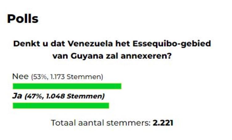 Uit een recente online peiling van Dagblad Suriname blijkt echter dat de publieke mening hierover verdeeld is: 53% (1.173 stemmen) gelooft niet in een annexatie van het Essequibo-gebied door Venezuela, terwijl 47% (1.048 stemmen) dit wel voor mogelijk houdt.
