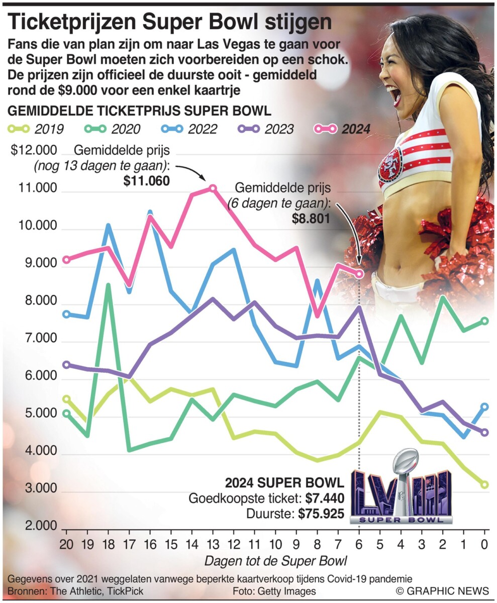 Kaartjes voor de Super Bowl LVIII van zondag tussen de Kansas City Chiefs en de San Francisco 49ers, die voor het eerst worden gespeeld in het Allegiant Stadium in Las Vegas, zijn de duurste in de geschiedenis van het evenement.