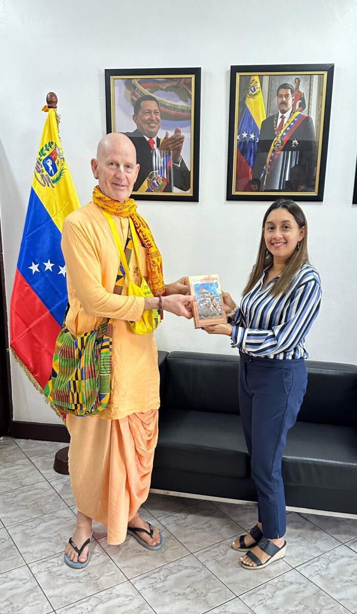 De ambassadeur van Venezuela, Ayerim Flores Rivas, ontving een exemplaar van de Bhagavad-gītā in het Spaans (Bhagavad-gītā tal como es) uit handen van Zijne Genade Janakinath dasa (de heer Jan Hilbrand Beukema), lid van de International Society for Krishna Consciousness (ISKCON).