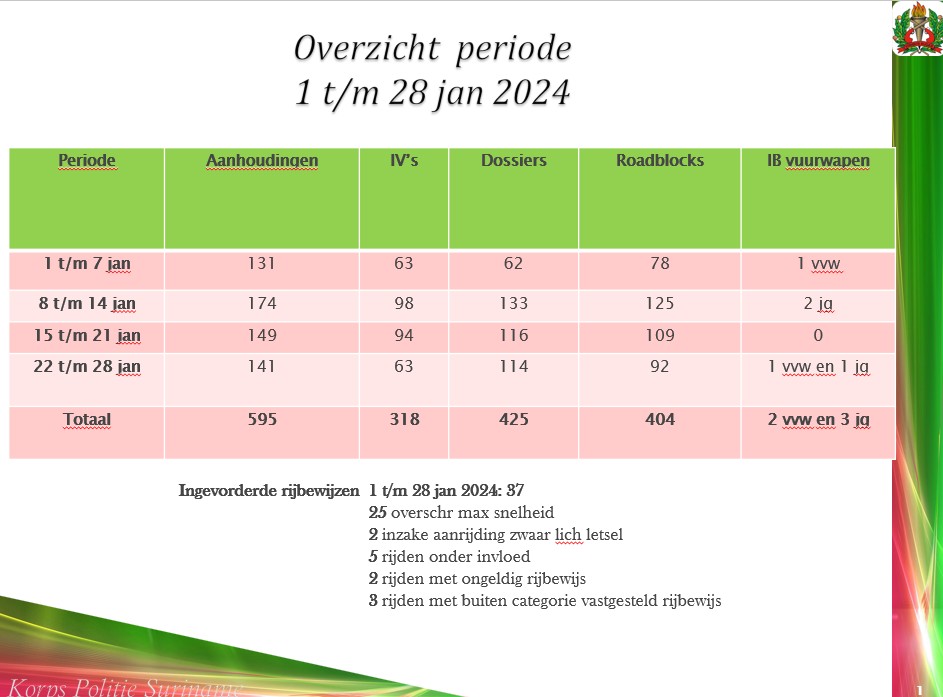 In de periode 1 tot en met 28 januari 2024, zijn landelijk 595 verdachten aangehouden. Hiervan zijn 318 verdachten in verzekering gesteld. In totaal zijn er 425 dossiers aangeboden aan het Openbaar Ministerie. Ook zijn er 404 roadblocks uitgevoerd en 5 illegale vuurwapens in beslag genomen. Door goed speurwerk van de politie, zijn er meerdere verdachten die voorkomen op de opsporingslijst ingerekend.