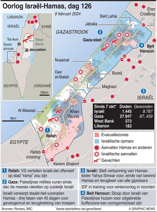 Het IsraĆ«lische leger bereidt een grondoperatie voor in Rafah, Gaza, op bevel van premier Netanyahu, te midden van het conflict waarbij de stad als een toevluchtsoord dient voor meer dan de helft van Gaza’s 2,3 miljoen inwoners. Deze operatie is gericht op de vernietiging van Hamas-bataljons in Rafah, voorheen beschouwd als een veilige zone. Netanyahu benadrukt de noodzaak om Hamas te elimineren voor het bereiken van de oorlogsdoelen en wijst op de behoefte aan evacuatie van burgers uit het gebied. Deze ontwikkeling volgt te midden van internationale bezorgdheid, met name kritiek van de Amerikaanse president Biden op het hoge risico van burgerdoden. Verder geweld in de regio omvat de dood van een 17-jarige Palestijnse jongen door IsraĆ«lische troepen in Beita op de Westelijke Jordaanoever. De escalatie heeft geleid tot een aanzienlijke toename van geweld en doden, de ernstigste sinds de Tweede Intifada, met honderden Palestijnen gedood in recente maanden. IsraĆ«l handhaaft een regime van militaire bezetting en kolonisatie in de Westelijke Jordaanoever sinds de Zesdaagse Oorlog van 1967.