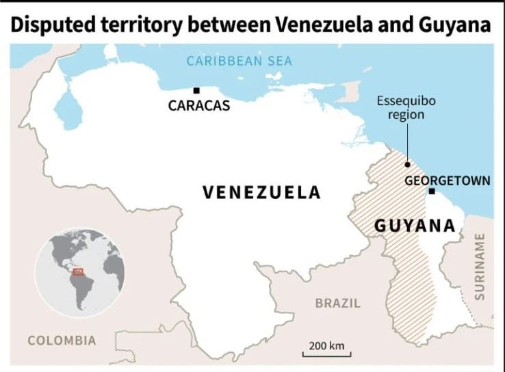 Venezuela, uitgerust met een leger van 150.000 man en geavanceerde Russische wapens, claimt de regio Esequibo, die tweederde van Guyana bestrijkt.