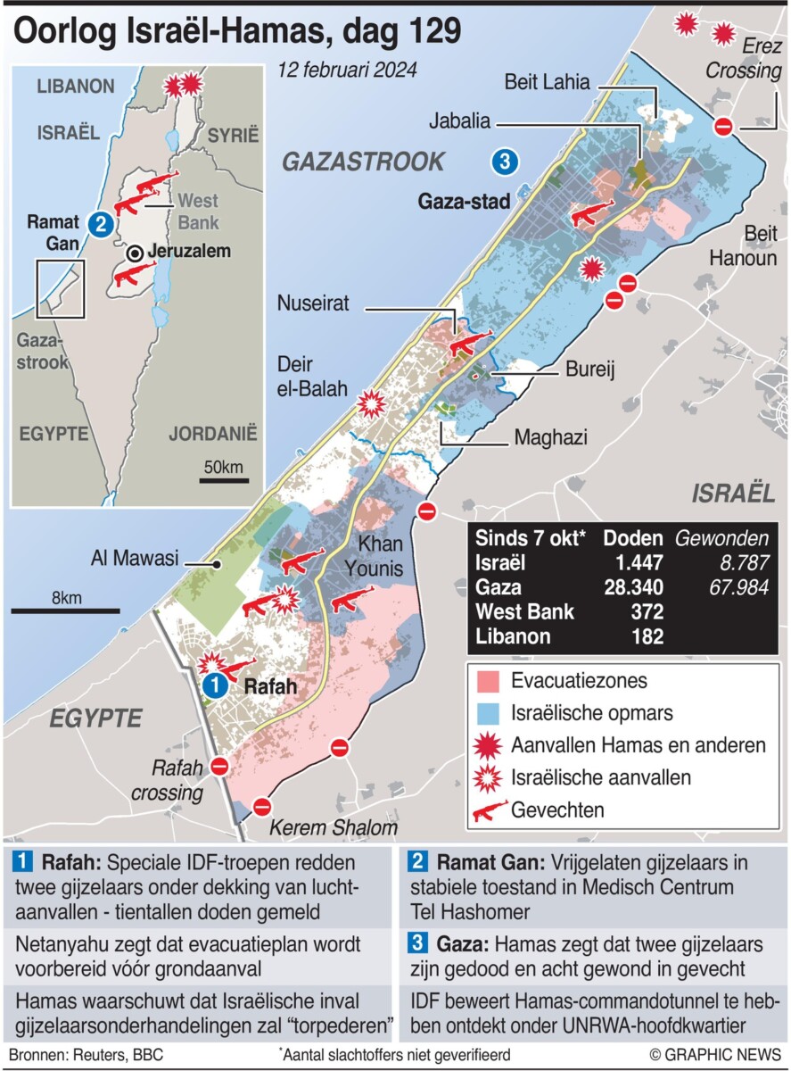 Te midden van groeiende bezorgdheid over een dreigende grootschalige aanval op de stad en onder druk van de VS heeft de Israëlische premier Benjamin Netanyahu de IDF opdracht gegeven plannen op te stellen voor een evacuatie van Rafah voordat het probeert de vier Hamas-bataljons die daar gestationeerd zijn, uit te schakelen. Hamas waarschuwde dat een Israëlische inval de huidige gijzelingsonderhandelingen met derde partijen zou ‘torpederen’.