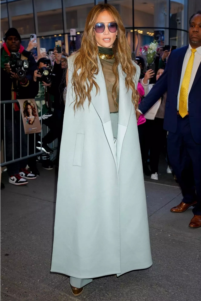 Als je de jassen beu bent, heeft Jennifer Lopez ons zojuist herinnerd aan een stijlvol alternatief dat je over truien, blouses en tops kunt dragen. De zangeres arriveerde voor haar gastoptreden in Saturday Night Live, gekleed in een lang grijs vest, dat ze over een doorzichtig zwart topje en een geplooide broek droeg. Ze stylede de look met elegante turquoise handschoenen, een zonnebril en plateauzolen.