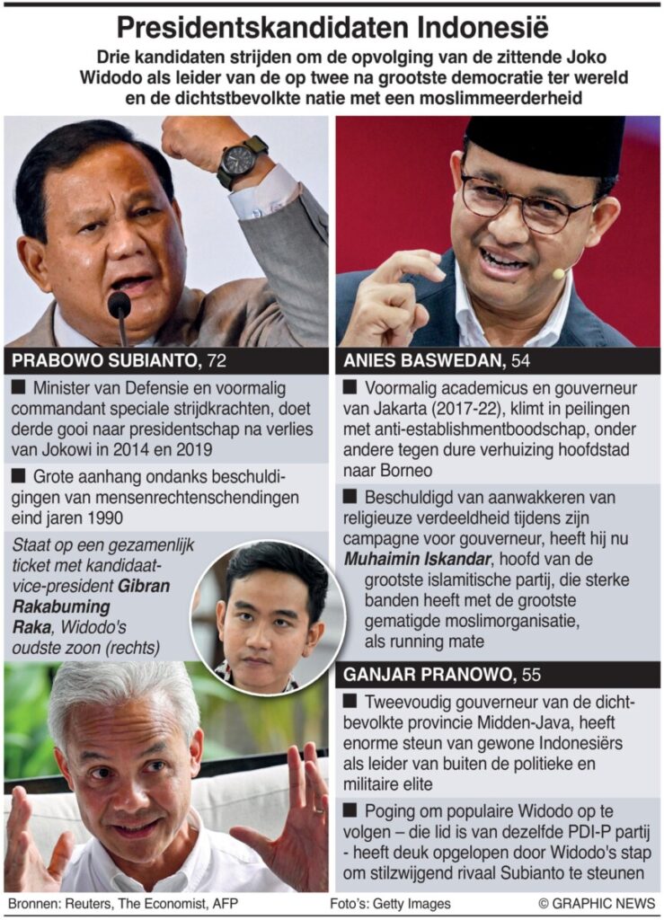 Prabowo, die eerder verloor van de huidige president Jokowi, heeft versterking gekregen door Jokowi’s zoon, Gibran Rakabuming Raka, als zijn vice-presidentskandidaat te kiezen. In zijn laatste campagnebijeenkomst beloofde Prabowo de welvaart van alle Indonesiërs te verhogen, ondanks eerdere beschuldigingen van mensenrechtenschendingen tijdens de jaren negentig onder het regime van Soeharto. Peilingen suggereren dat Prabowo in de eerste ronde zou kunnen winnen met 51,8% van de stemmen, voor op zijn rivalen Anies Baswedan en Ganjar Pranowo.