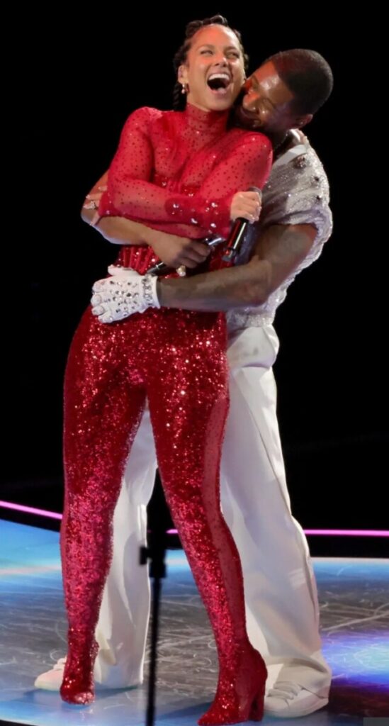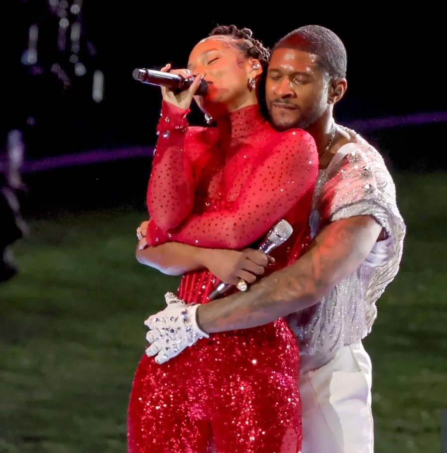 Alicia (43) en Usher (45) dansten dicht bij elkaar terwijl ze hun duet uit 2004, My Boo, uitvoerden tijdens de pauze van de Super Bowl in Las Vegas zondagavond. Usher – die later in de show een technische blunder kreeg – sloeg zijn armen om het middel van de Fallin’-zanger terwijl ze op het podium op de muziek zwaaiden.