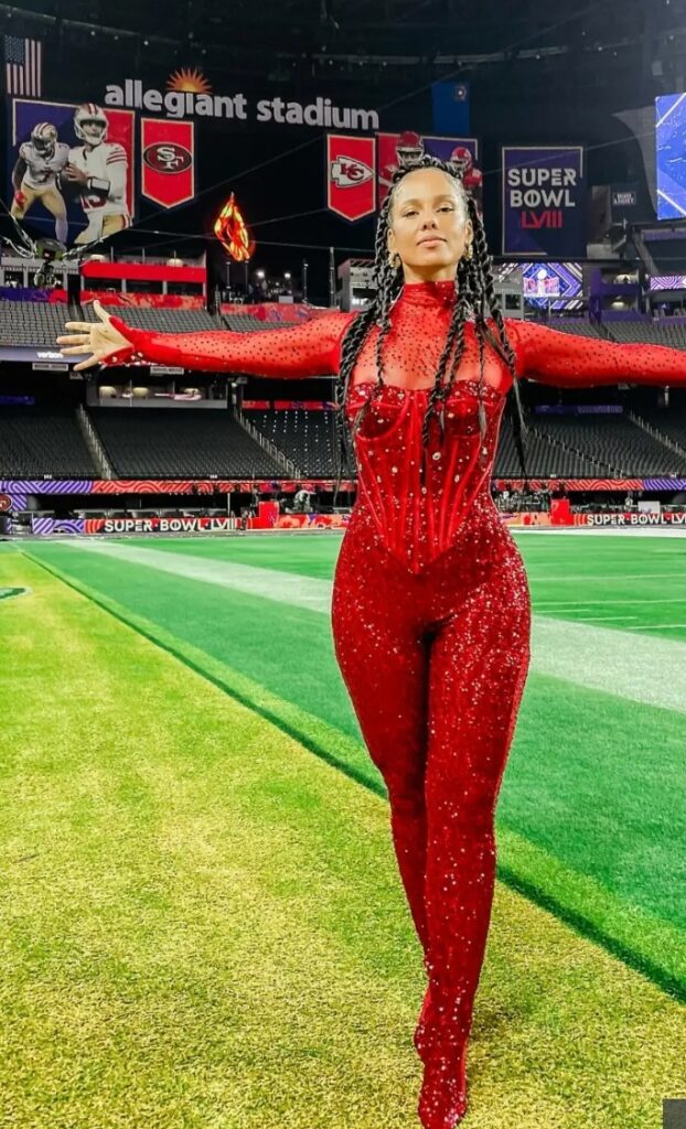 Alicia, gekleed in een rode bodysuit met juwelen, zong ook haar hitsingle If I Ain’t Got You. Een disclaimer die vóór de Super Bowl-show werd getoond, waarschuwde de kijkers gekscherend dat dit “zingen, dansen, zweten, ronddraaien en mogelijke relatieproblemen” zou kunnen veroorzaken.