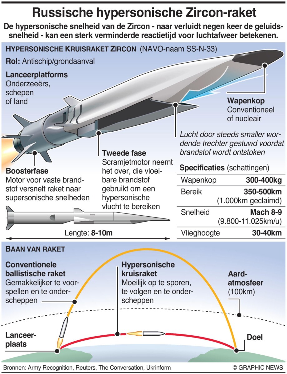De Zircon heeft een bereik van 1.000 km en reist volgens Rusland negen keer zo snel als het geluid. Militaire analisten hebben gezegd dat de hypersonische snelheid een sterk verminderde reactietijd voor de luchtverdediging zou kunnen betekenen en een vermogen om grote, diepe en verharde doelen aan te vallen, aldus Reuters.