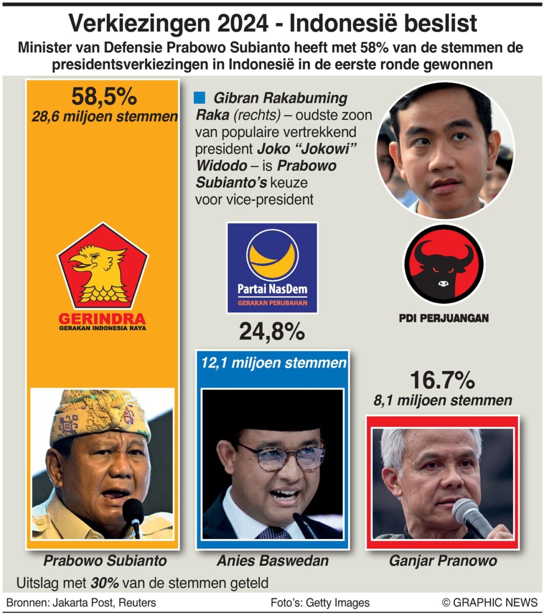 February 15, 2024 – Minister van Defensie Prabowo Subianto heeft 58% van de stemmen behaald bij de Indonesische presidentsverkiezingen en heeft volgens onofficiële steekproefcijfers van opiniepeilers in de eerste ronde gewonnen.
