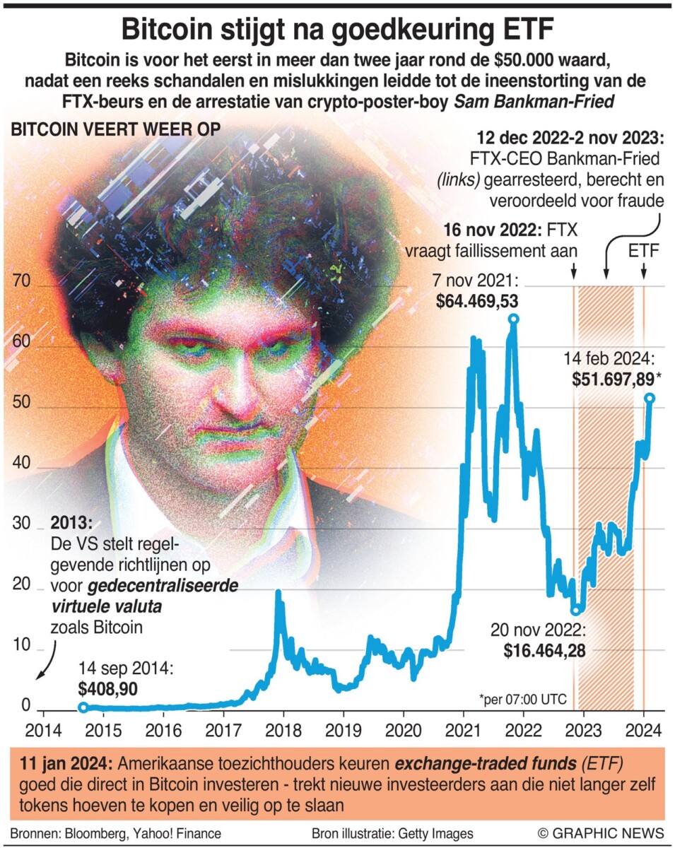 14 februari 2024 – Bitcoin is voor het eerst in ruim twee jaar ongeveer $50.000 waard, nadat een reeks schandalen en mislukkingen leidde tot de ineenstorting van de FTX-beurs en de arrestatie van crypto-posterjongen Sam Bankman-Fried.