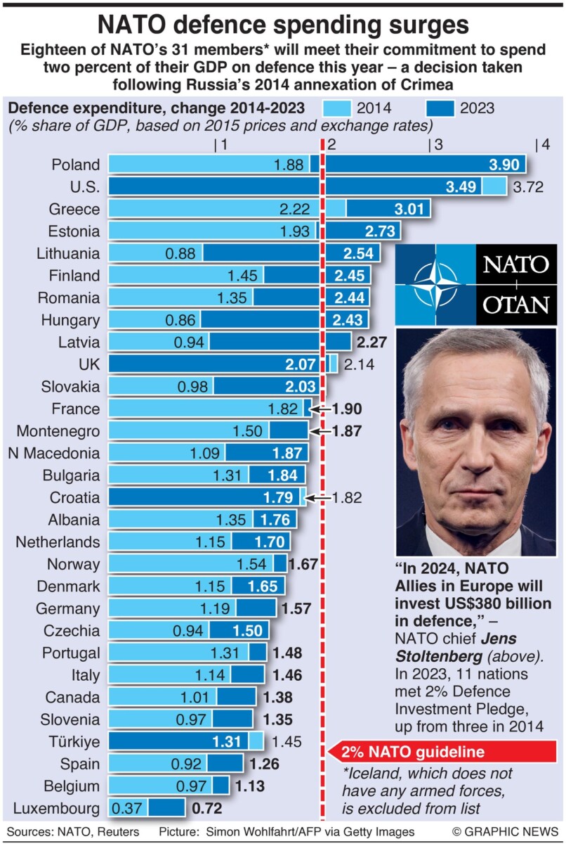 February 15, 2024 – Achttien van de 31 NAVO-leden zullen hun belofte nakomen om dit jaar twee procent van hun bbp aan defensie te besteden – een besluit dat werd genomen na de Russische annexatie van de Krim in 2014.