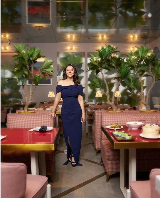 Haar make-up en haar blijven consequent minimaal, precies zoals zij het graag heeft. Zoals bij elke zakelijke onderneming doet Gauri Khan het woord als de vrouw die ze is. Haar kledingkeuzes zijn tenminste altijd duidelijk. Dus toen ze een strakke off-shoulder nachtblauwe jurk uitkoos die tegen de zachte, decoratieve inrichting van het restaurant paste, ging ze meteen op in het interieur en viel ze op wanneer ze maar wilde.
