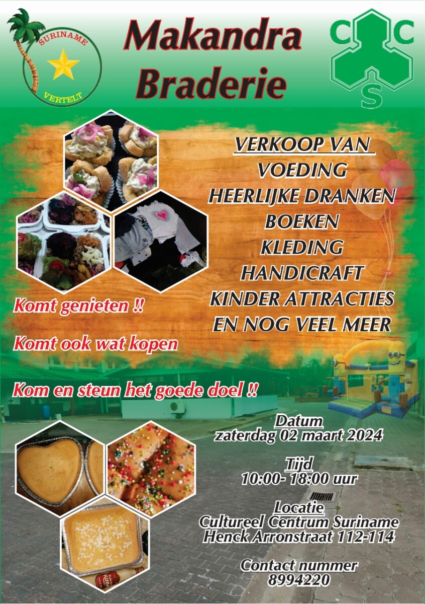 De Makandra Braderie nodigt zaterdag 2 maart de gemeenschap uit voor een unieke dag van gezelligheid en verbinding in de vorm van een braderie op het terrein van CCS. Het is een initiatief van Ryan Bergen en Stichting Suriname Vertelt, met als doel het versterken van het wij-gevoel en het bevorderen van samenhorigheid in de samenleving.