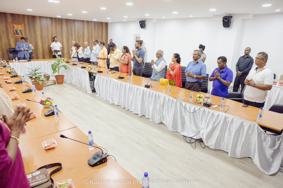 President Chandrikapersad Santokhi is maandag 19 februari in gebed gegaan met diverse hindoe geestelijken uit Suriname en het buitenland die op beleefdheidsbezoek bij de president waren. President Santokhi vond het een eer dat een groot gezelschap van geestelijken uit Suriname, India, Nederland en de VS bij hem aanwezig waren om te bidden.