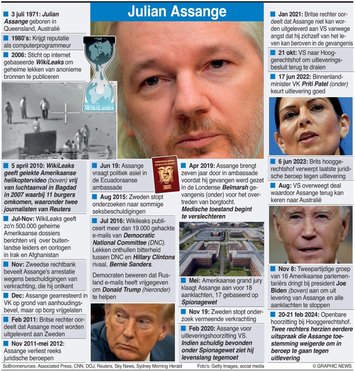Amerikaanse aanklagers zeggen dat hij samenzweerde met de Amerikaanse inlichtingenanalist Chelsea Manning om een computer van het Pentagon te hacken en geheime diplomatieke telegrammen en militaire bestanden over de oorlogen in Irak en Afghanistan vrij te geven.