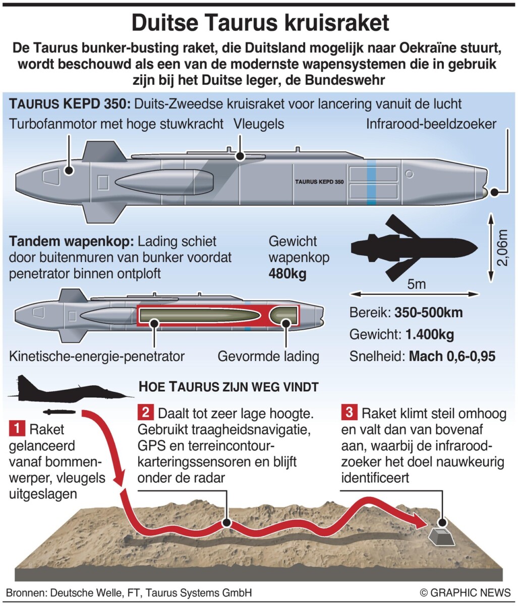 Taurus heeft een groter bereik en meer verfijning dan de Britse Storm Shadow- en Franse Scalp-kruisraketten die vorig jaar aan Oekraïne zijn geleverd. Het zou in staat zijn Moskou te bereiken en de meeste Russische luchtafweer te ontwijken, aldus de FT.