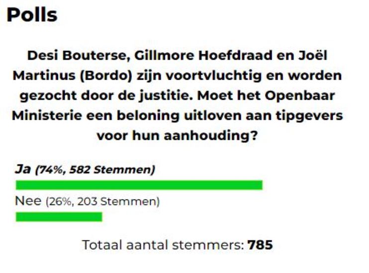 In een recente webpeiling uitgevoerd door Dagblad Suriname, komt naar voren dat een overweldigende meerderheid van de respondenten voorstander is van het idee, dat het Openbaar Ministerie een beloning zou moeten uitloven voor tips die leiden tot de aanhouding van Desi Bouterse, Gillmore Hoefdraad en Joël Martinus (ook bekend als Bordo). Alle drie figuren zijn momenteel voortvluchtig en worden actief gezocht door de justitiële autoriteiten.